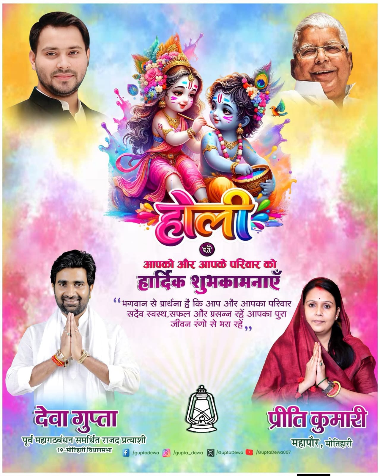 आप सभी सनातनी भाई और बहनों को होली की हार्दिक शुभकामना भगवान भोलेनाथ आप सबों पर अपनी कृपा बनाए रखे पार्टी प्रमुख श्री उमेश सिंह जी ने सभी को शुभकामना देते हुए आग्रह किया है वैसे लोगों से दुरी बनाकर रहे जिसे होली पसंद नहीं है, सभी सनातनी आपसी प्रेम और भाईचारे के साथ मनाएं ,इस होली में सभी सनातनी भाई और बहनें इस मंत्र को आत्मसात करें ताकि आपसी एकता बनी रहे, सबके हम सब हमारे हमे किसी से बैर नहीं हमारे लिए कोई गैर नहीं,यह सिर्फ राष्ट्र भक्तो और सनातनीयो के लिए रहे, सभी सनातनी लालच और स्वार्थ से ऊपर उठकर एक दुसरे से जुड़े(रमेश पासवान प्रवक्ता)